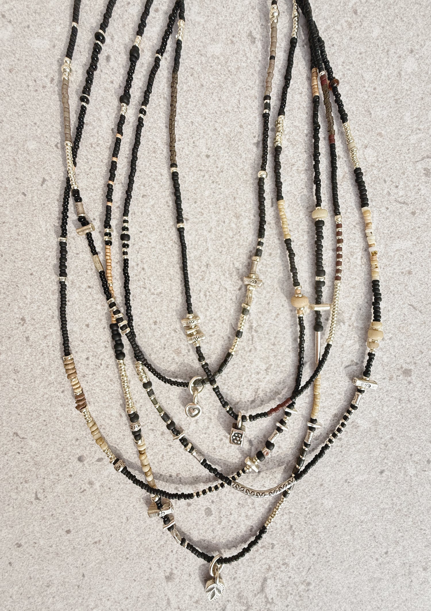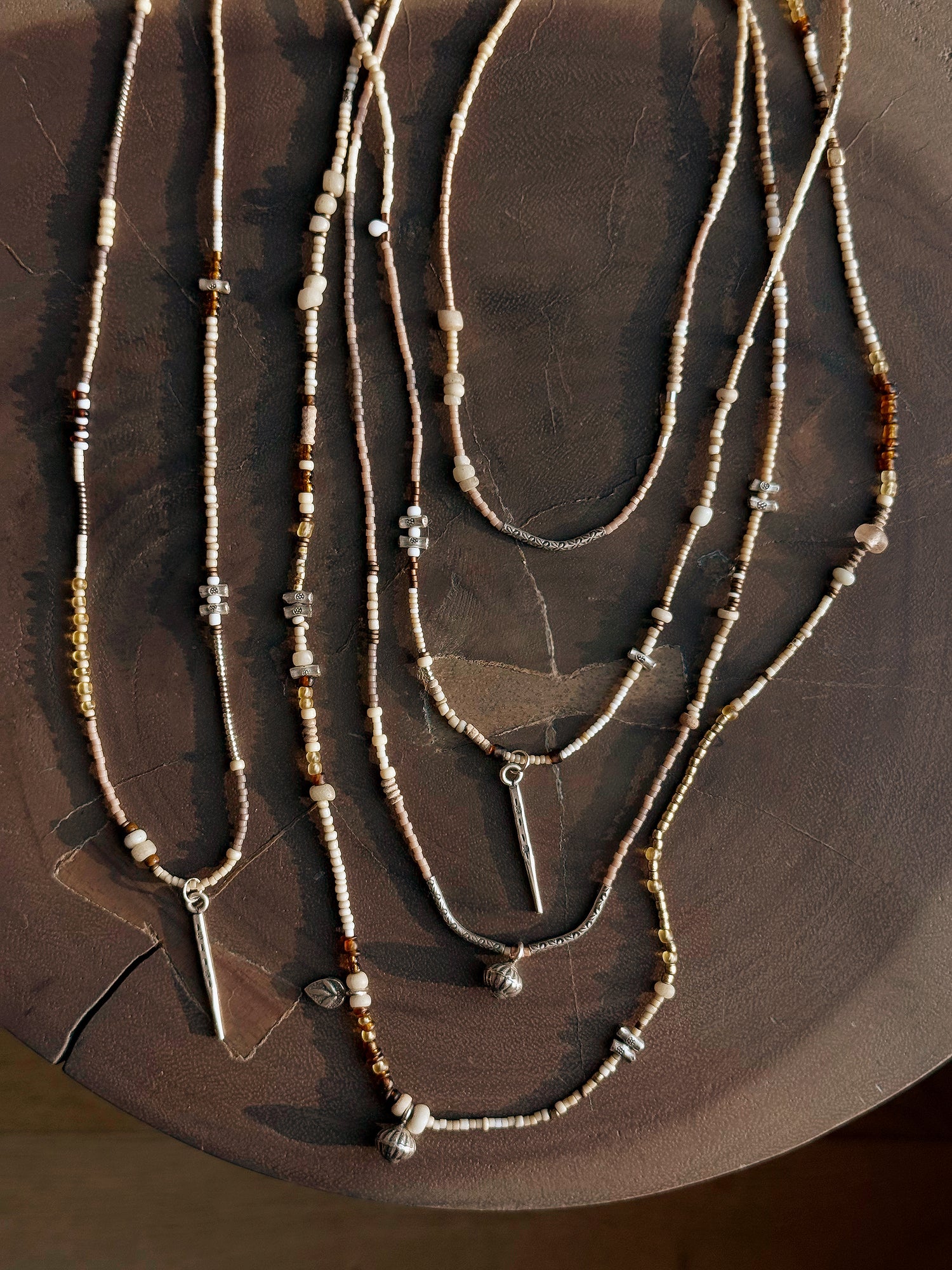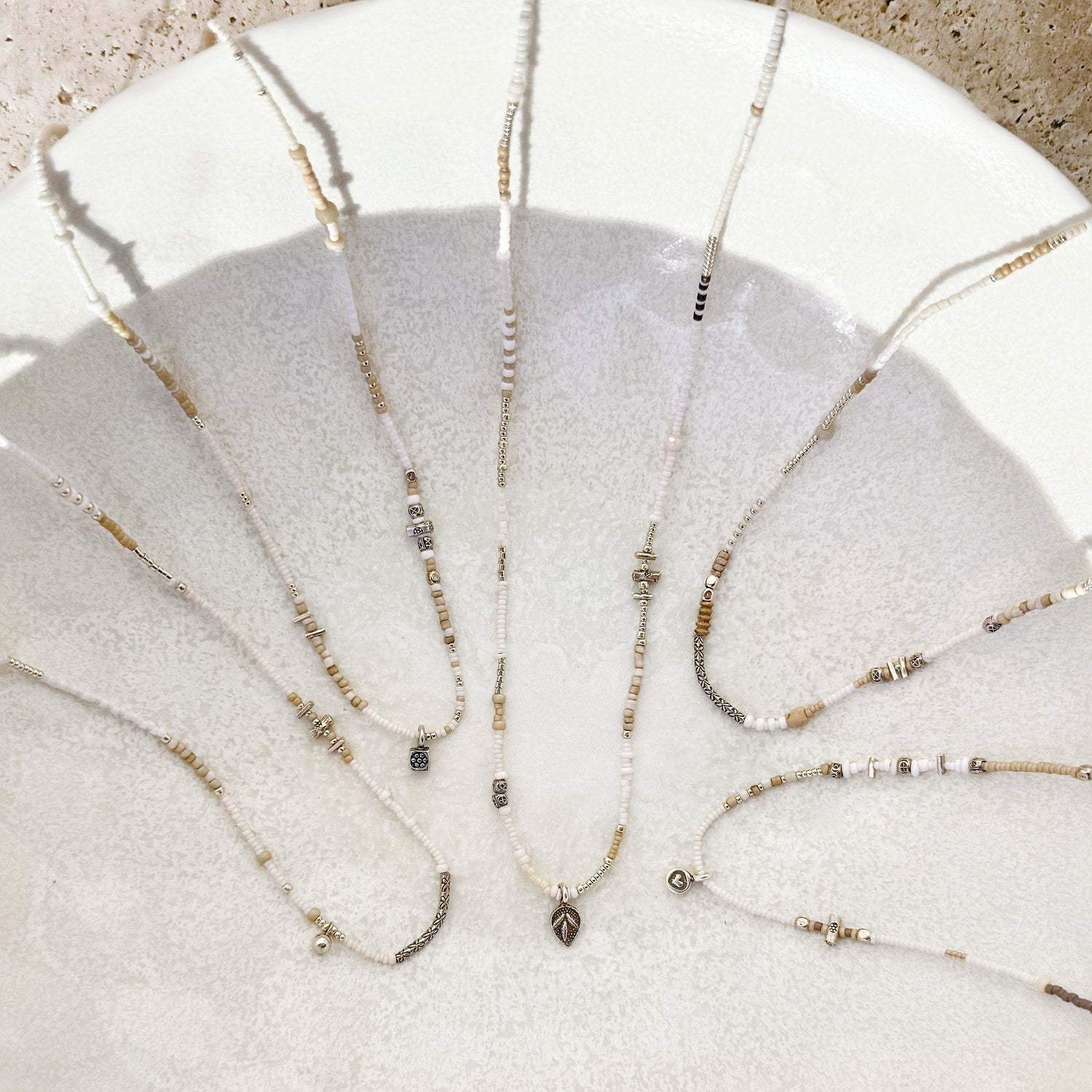 Each piece is made by hand using Japanese glass beads, paired with silver and select global accents. Materials are chosen for their quality, durability, and subtle character, then assembled intuitively, one at a time.